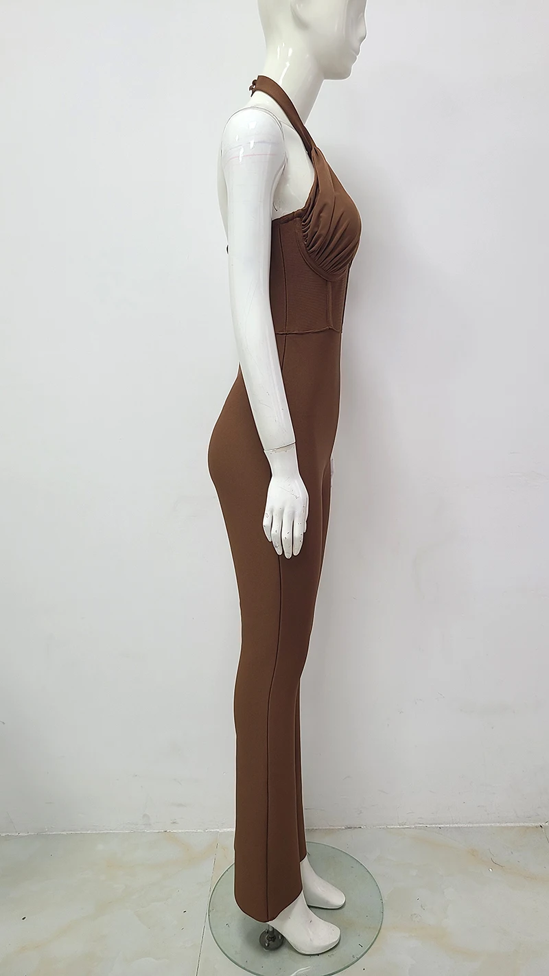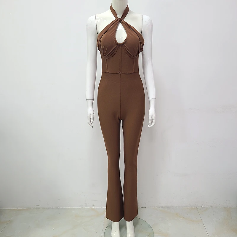 2023 New Sleeveless High Quality Fashion Stretch Wholesale Bandage Jumpsuit Women Long Bodysuit Brown Halter Sexy Backless
