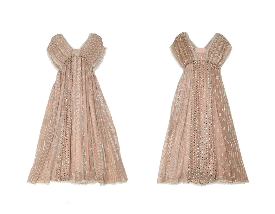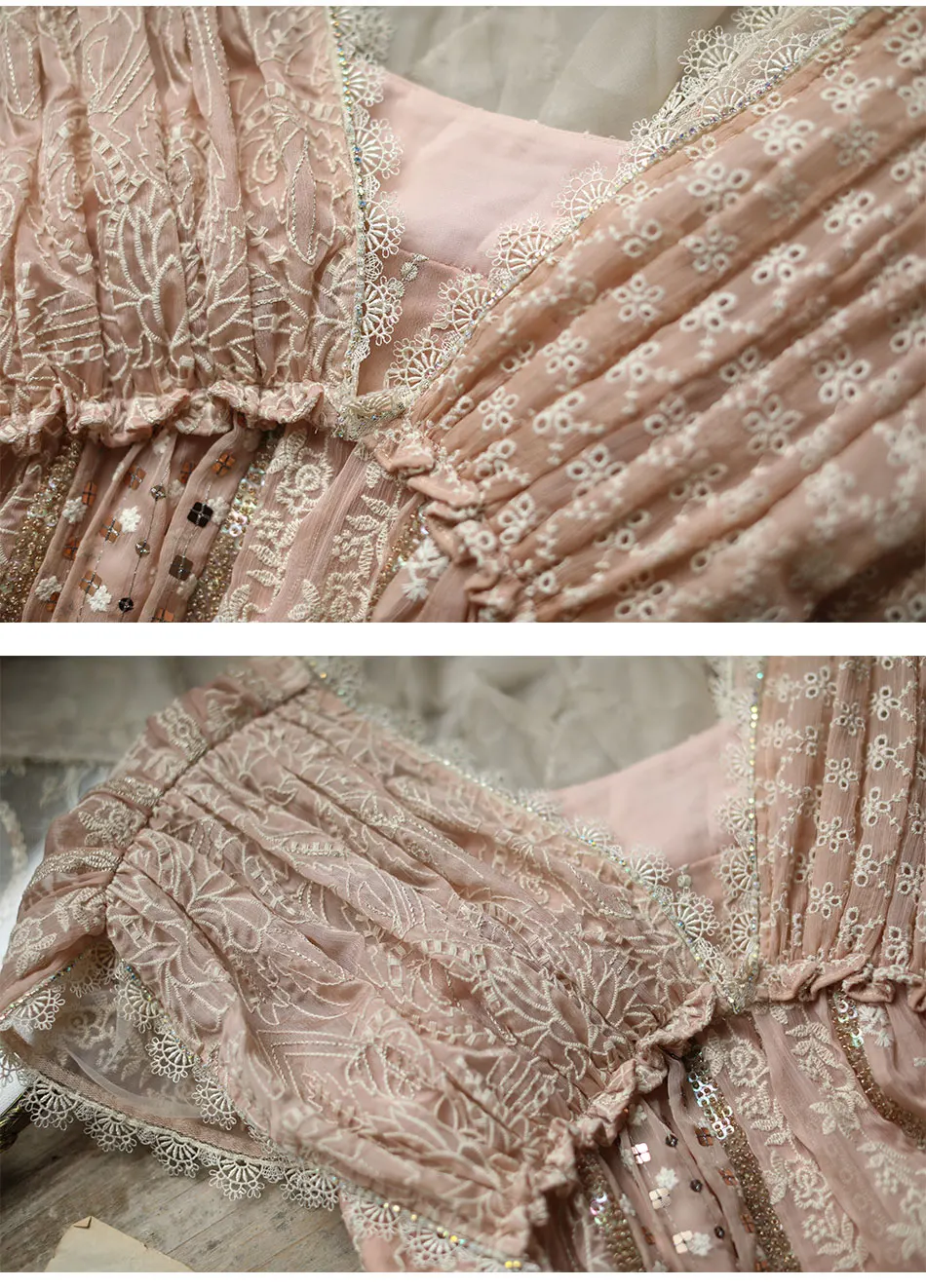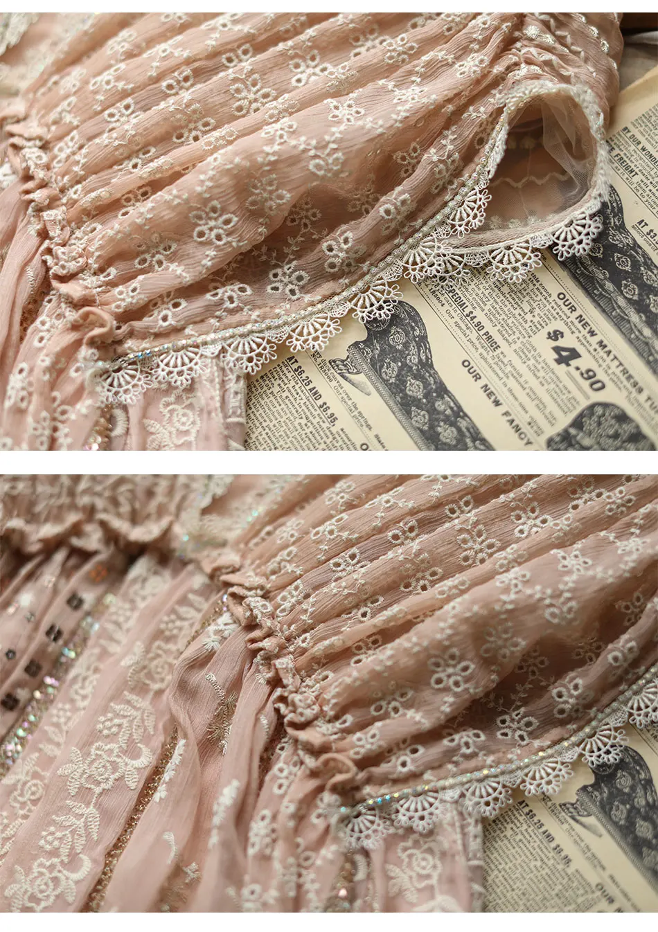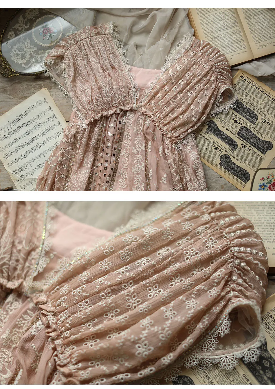 AIGYPTOS Spring Summer Women Pink Dress Vintage Elegant Slim Lace V-Neck Shiny Sequines Luxury Embroidery Party Birthday Dress